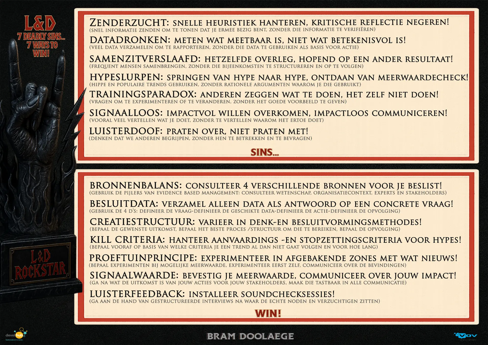 Deze twee zonden zijn een voorproefje. Op de VOV-Beurs speelt Bram Doolaege het volledige album: alle zeven zonden én zeven manieren om ze te doorbreken. Wil je ontdekken hoe zenderzucht, samenzitverslaving, hypeslurperij, de trainingsparadox en signaalloosheid aangepakt kunnen worden, dan zal je het live moeten meemaken. Zoals bij een goed Iron Maiden-concert geldt ook hier: je begrijpt pas echt waarom het werkt als je erbij bent.